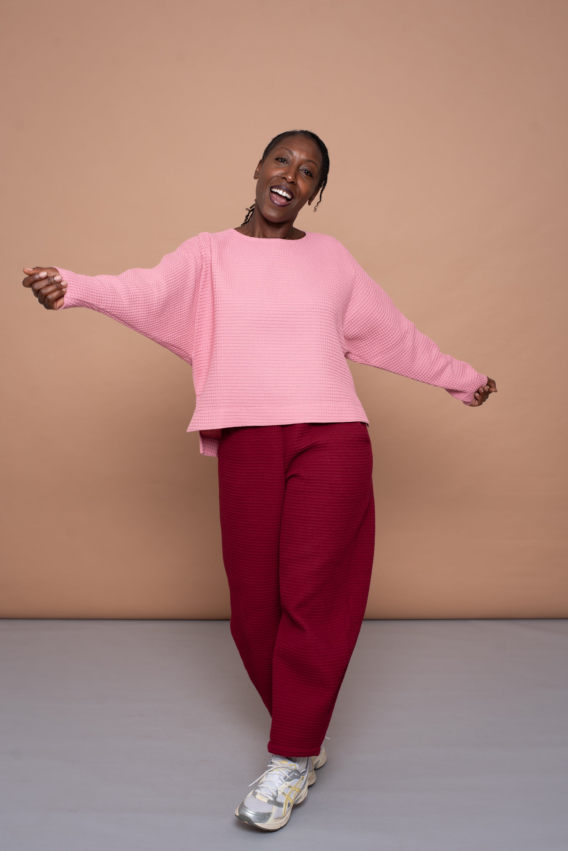 Hergestellt in Deutschland aus hochwertigem Baumwoll-Piqué mit großformatiger Waffelstruktur, viel Volumen und weichem Griff, mit eingesetzten Taschen.