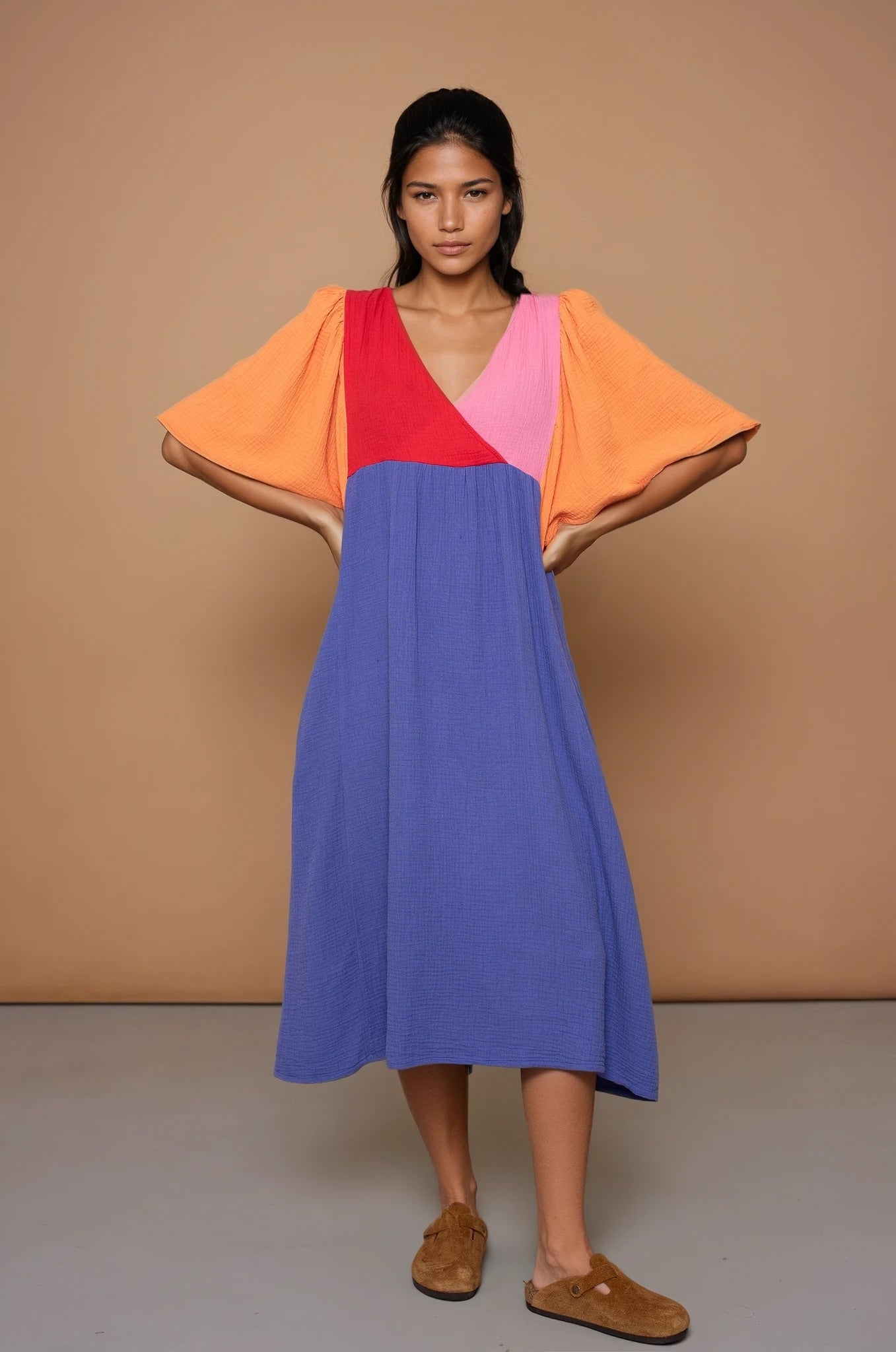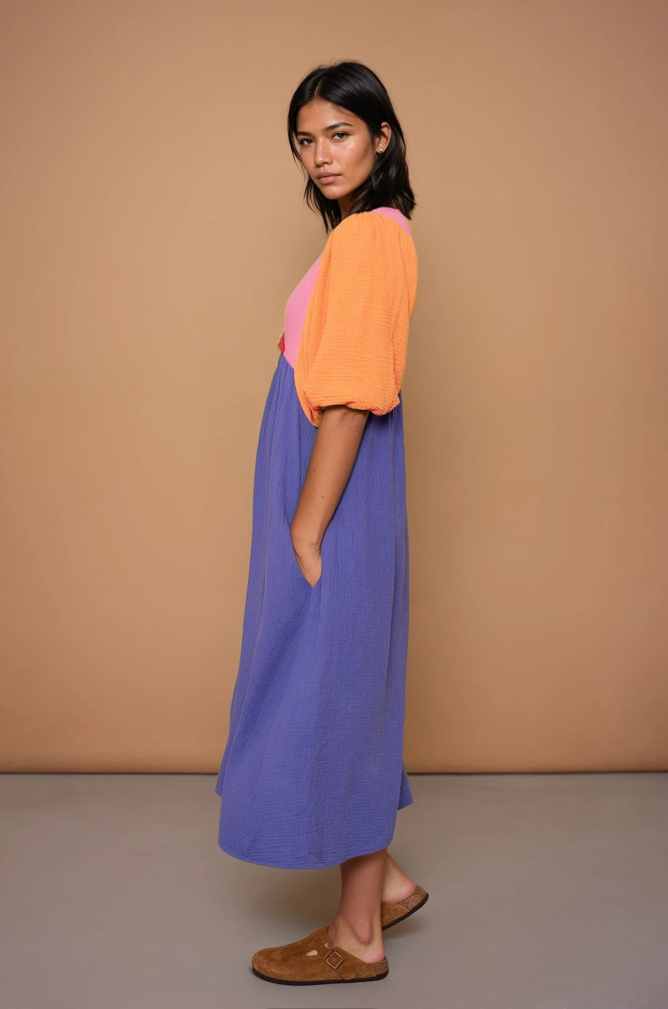 Kleid im Colour-Blocking Look mit eingesetzen Taschen in Double-Gauze-Qualität. Zwei feine Lagen Baumwolle sind dabei punktuell miteinander verbunden und ergeben ein luftiges, angenehm strukturiertes Material mit trockenem Griff.
